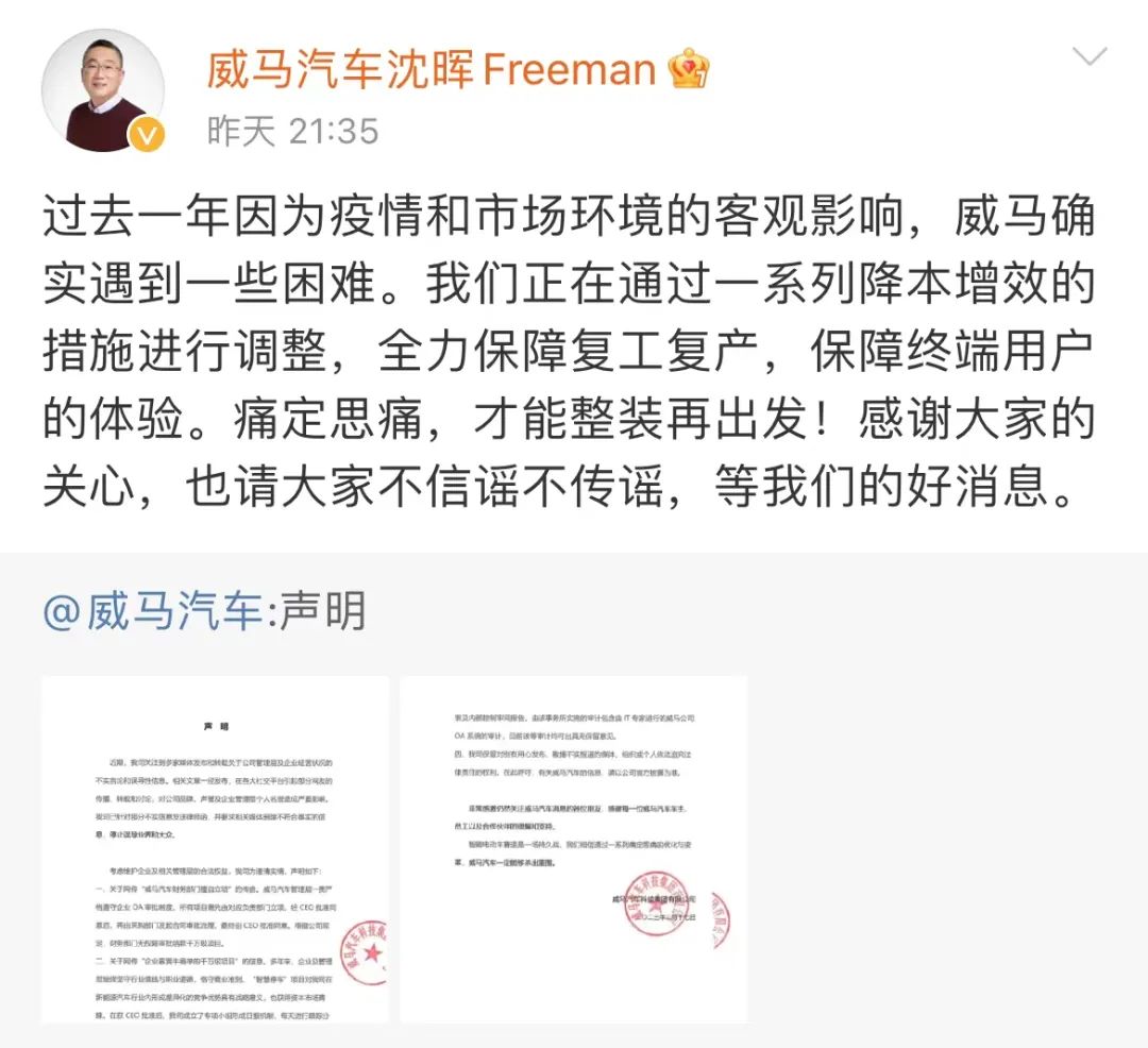 同时,威马汽车官方微博也发布了一则声明,对近期网络上传播的公司管理层及企业经营状况的不实言论进行辟谣。